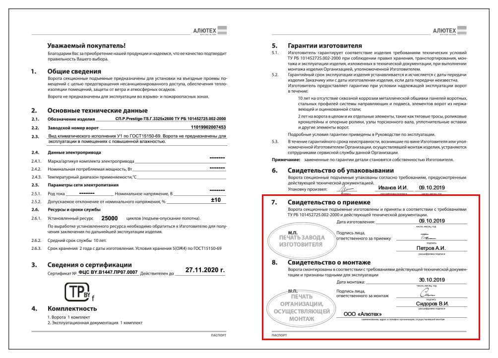 Если будут выявлены указанные выше недостатки, то монтажная бригада обязана их устранить. - Получите от представителя монтажной бригады документы на ворота: руководство по эксплуатации, паспорт изделия с отметкой даты монтажа и печатью организации-установщика.